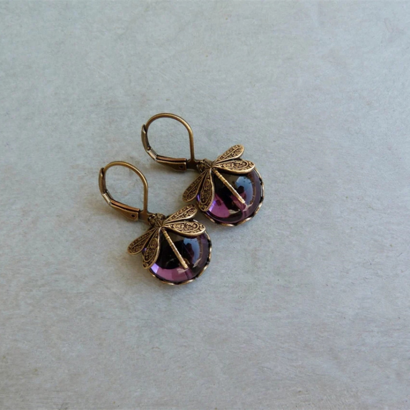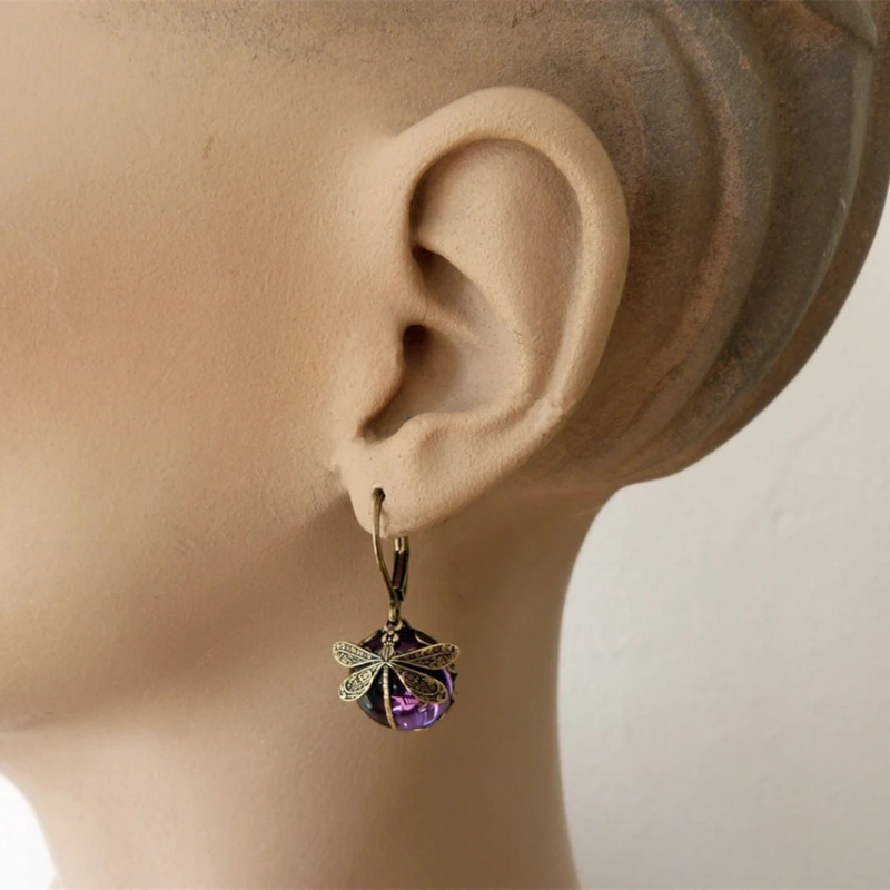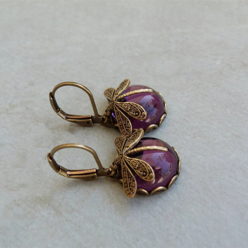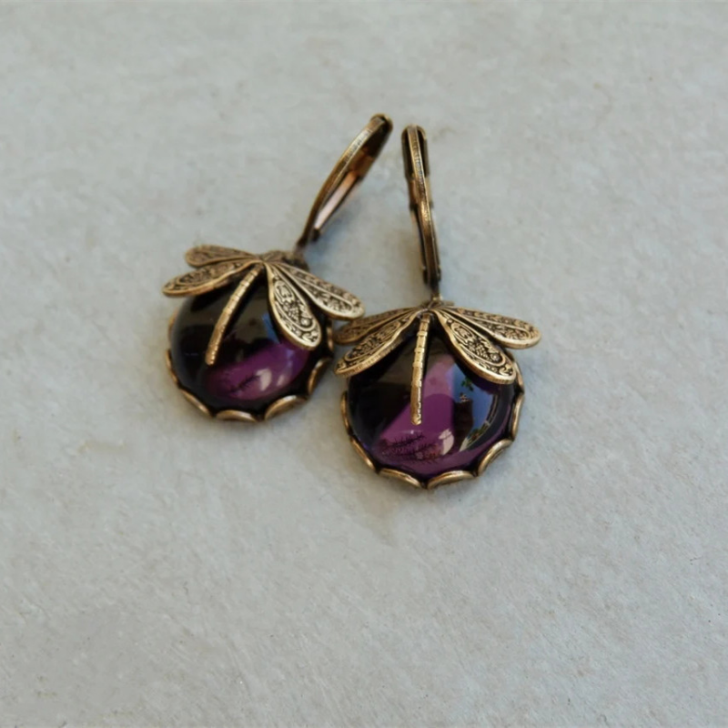 Dragonfly Glass Cabochon Gold Summer English Garden Ladies Romantic Gift Earrings
