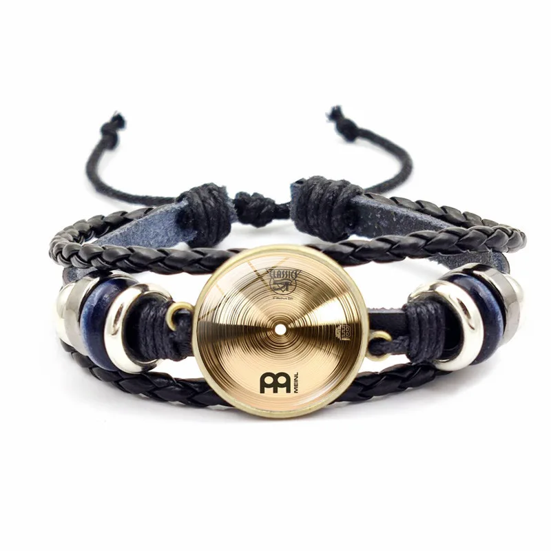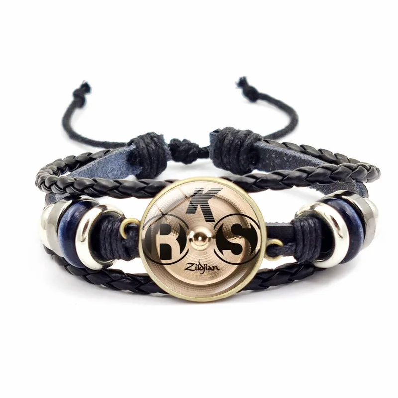 Retro Drummer Cymbals Bracelet for Men Women DJ Vinyl Record Gramophone Pattern Glass Button Leather Bracelets Bangle