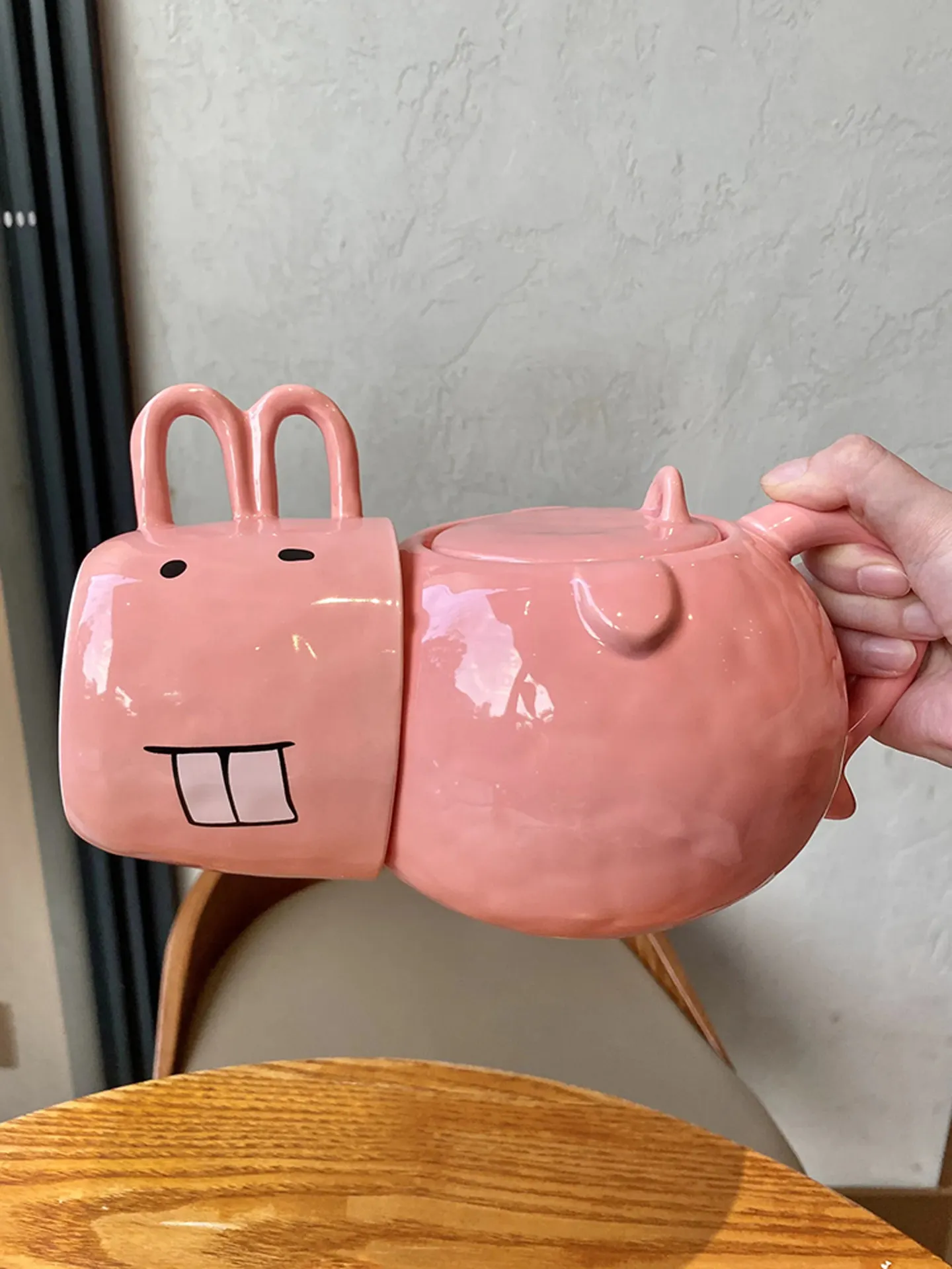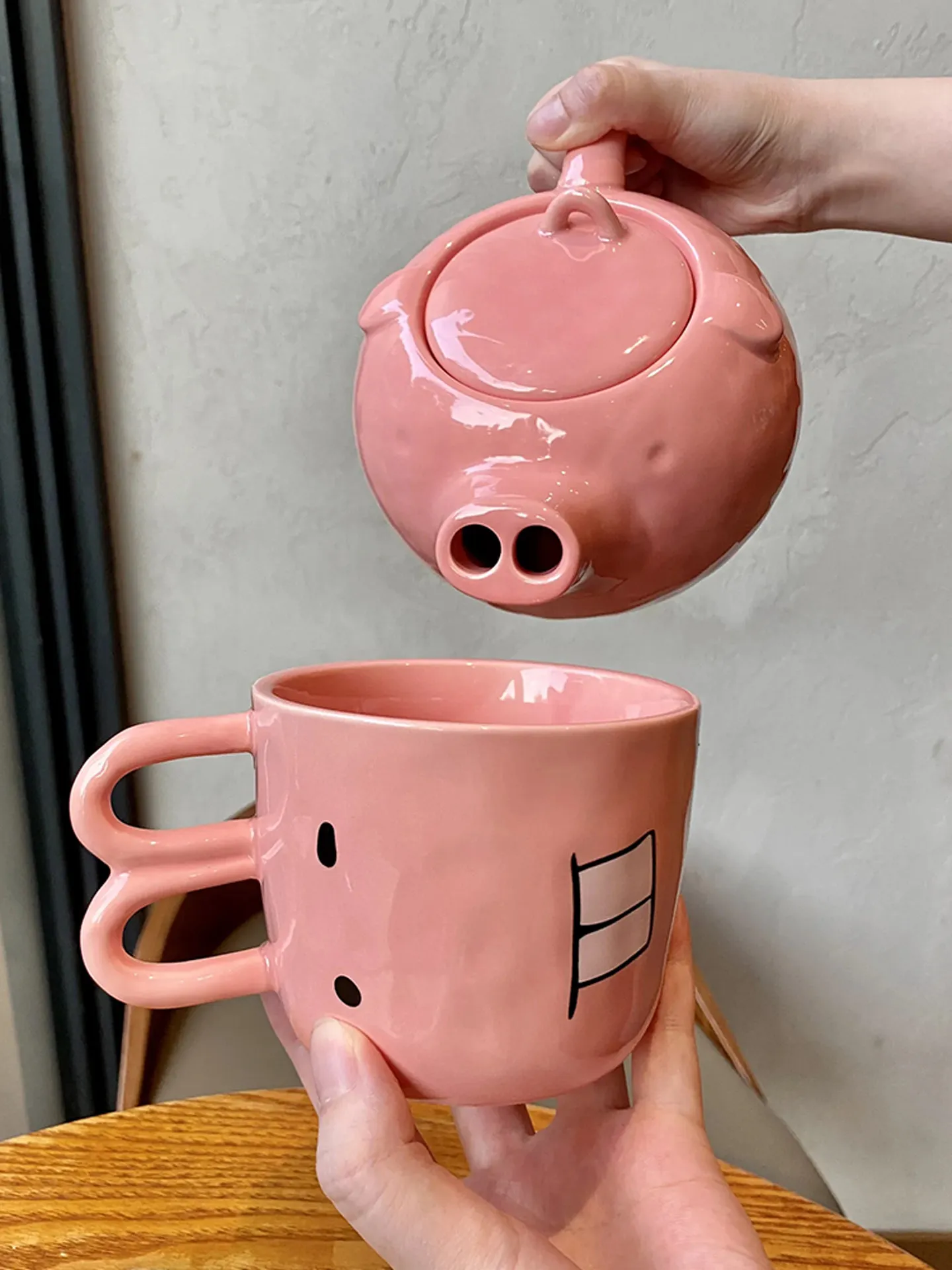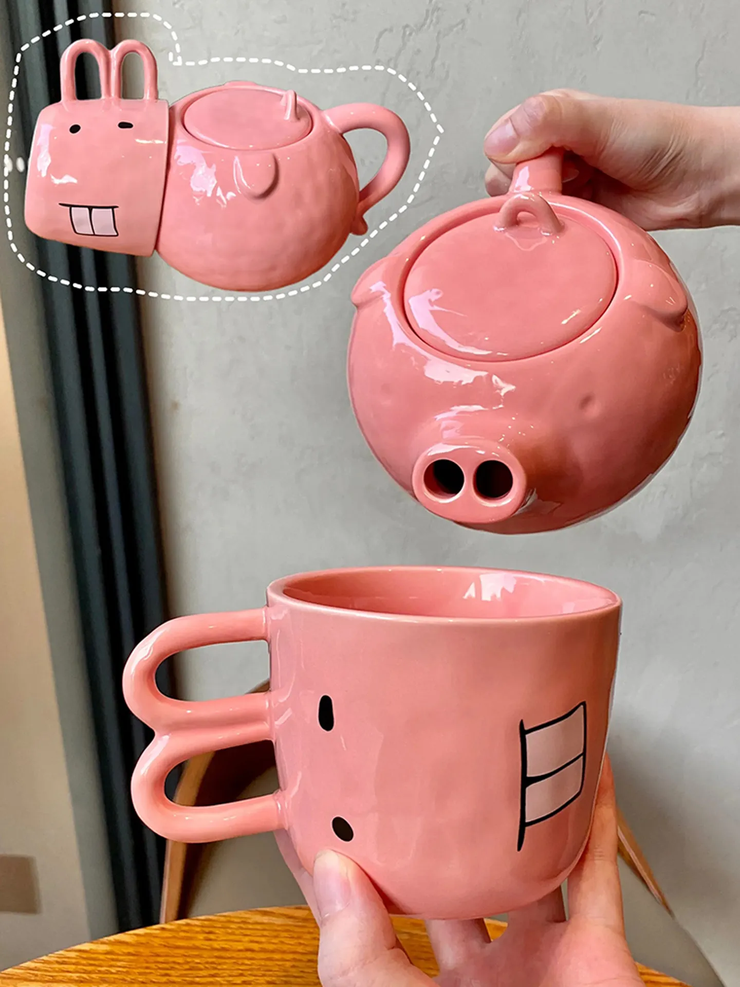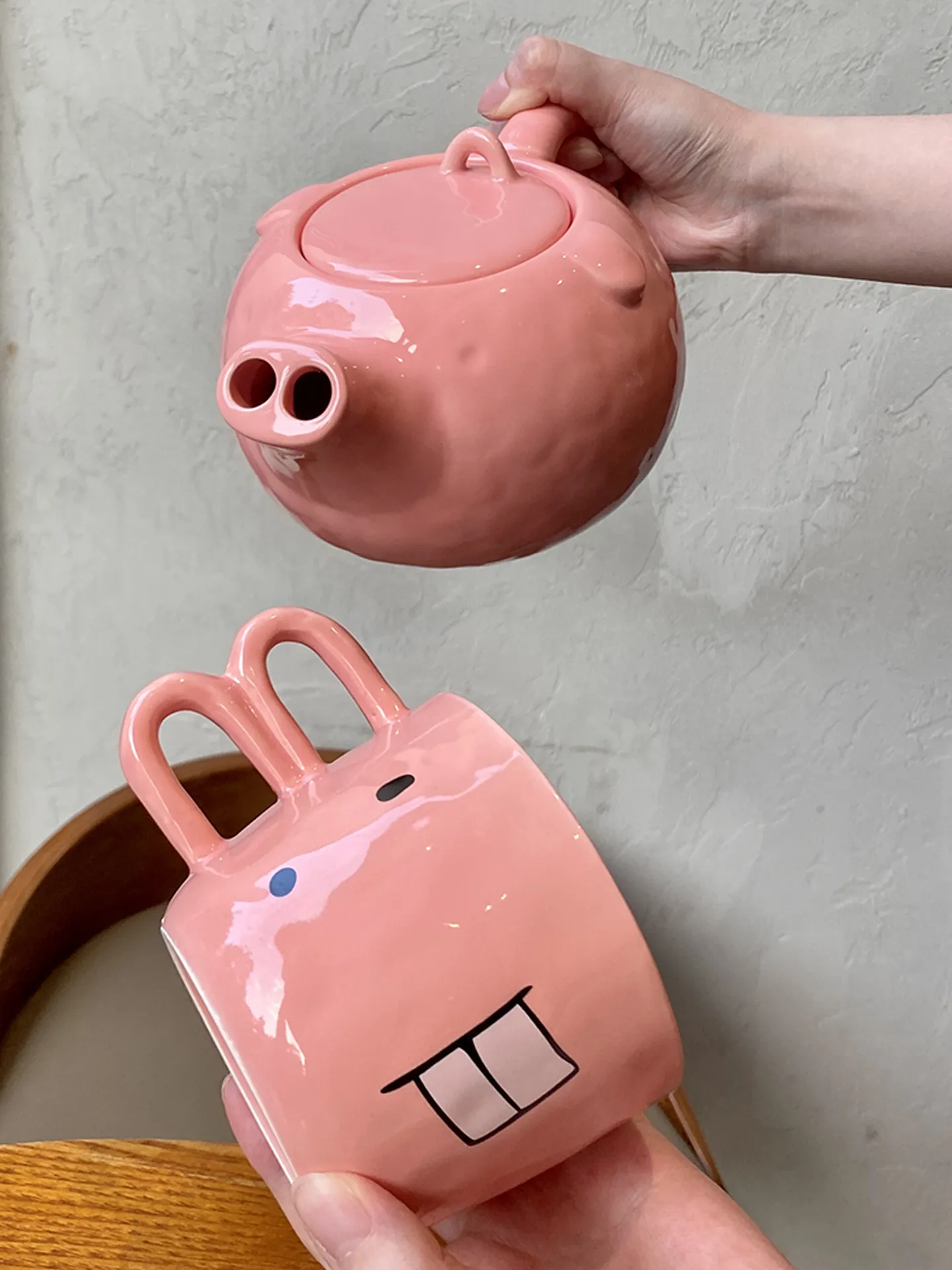 Uniquely Creative Design: The charming pink pig design features a snout-shaped spout that creates a fun “water-spraying” effect when pouring. The matching mug adds a playful touch with its cartoon expression.